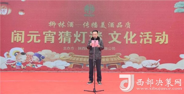 陜西柳林酒業(yè)有限公司副總經(jīng)理周峰發(fā)表講話并向鳳翔父老送上新春祝福和節(jié)日的問候。“三陽開國泰,美哉柳林酒。今天是正月十五,首先我代表柳林酒業(yè)董事長付小銅先生、總經(jīng)理柳林先生及全體員工給現(xiàn)場的父老鄉(xiāng)親、朋友們拜個晚年,祝各位家庭好、事業(yè)好、身體好心情好、運氣好、福氣好、財氣好、愛情好、朋友好、新的一年一切都好!柳林酒業(yè)主辦的以傳播柳林美酒品質(zhì)為主題的“鬧元宵有獎猜燈謎文化活動”,在此,對前來的各位父老鄉(xiāng)親,各界朋友表示衷心的感謝。本次猜謎活動獎品總價值15萬元,共設(shè)1000條謎語,只要猜中謎底,關(guān)注“柳林酒業(yè)”,即可獲得獎品。現(xiàn)場更有國家級評酒大師親臨現(xiàn)場,品柳林美酒,共同傳播美酒文化和歌舞表演環(huán)節(jié),相信大家一定會不虛此行,度過一個難忘的元宵佳節(jié)。