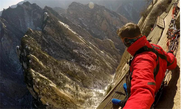 我獨自一人出發(fā),一段垂直的石隙,鐵條插在巖石之中,道路向下延伸,風(fēng)刮得很大,我雙手麻木,死死地抓住鐵鏈,慢慢向下挪動,腳下是一千米深的峽谷,這是一個恐懼與光榮交織的時刻。我走在棧道上,左右上下地欣賞著風(fēng)景,周圍大山巨大而孤獨,我感覺自己就像是一個塵埃,真的太渺小了。冰屑落到頭頂上,幸虧不是石塊。我聽到一群中國游客笑著從石隙中下來,我停下來照了幾張相,要回去必須原路返回,這同樣不容易,我很感謝地歸還了手套,繼續(xù)向其他山峰攀登。由于有安全保護措施,因此我不認(rèn)為華山是“世界上最危險的道路”。