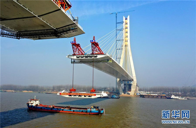 3月13日,在安徽池州長(zhǎng)江公路大橋建設(shè)現(xiàn)場(chǎng),中交二航局施工機(jī)械在吊裝鋼箱梁(無(wú)人機(jī)拍攝)。新華社發(fā)(過仕寧 攝)
