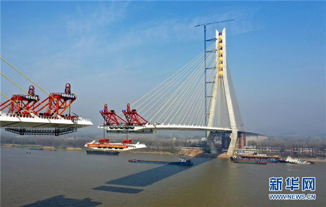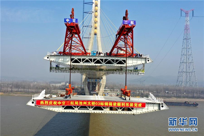 安徽池州長(zhǎng)江公路大橋主橋長(zhǎng)5.8千米,為雙塔雙索面斜拉橋,主跨828米,是連接安徽長(zhǎng)江兩岸的又一條快速通道,預(yù)計(jì)3月底實(shí)現(xiàn)主橋合龍,6月底具備通車條件。