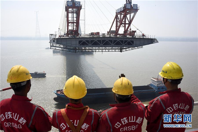 3月13日,在安徽池州長(zhǎng)江公路大橋建設(shè)現(xiàn)場(chǎng),施工人員在關(guān)注鋼箱梁吊裝進(jìn)度。新華社發(fā)(過仕寧 攝)
