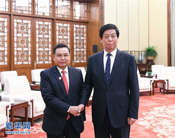 全國(guó)人大常委會(huì)委員長(zhǎng)栗戰(zhàn)書19日在人民大會(huì)堂會(huì)見老撾建國(guó)陣線中央主席賽頌蓬。