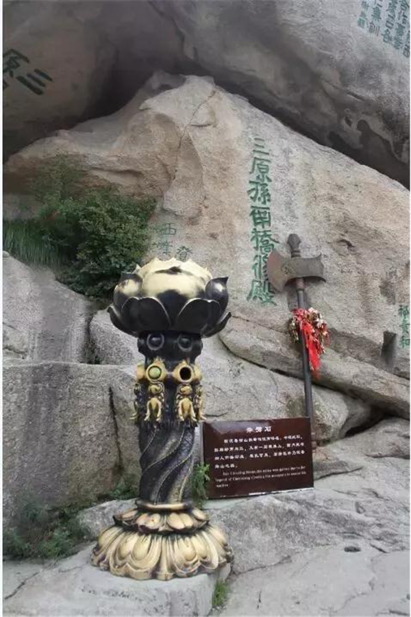 奇特之處:此奇石位于蓮花峰巔。一巨石一分為三,截面如刀削斧劈,石縫能容人出入,石下有凹凸,形似婦人仰臥的印痕,形象生動。