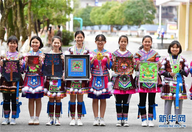 在融水苗族自治縣民族中學,女童班的學生在展示刺繡作品(3月22日攝)。 新華社記者 黃孝邦 攝