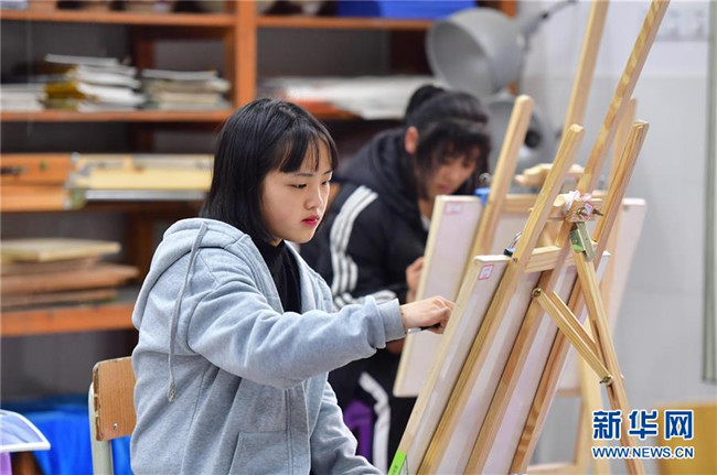 在融水苗族自治縣桿洞中學,學生在繪畫室里上課(3月13日攝)。 新華社記者 黃孝邦 攝
