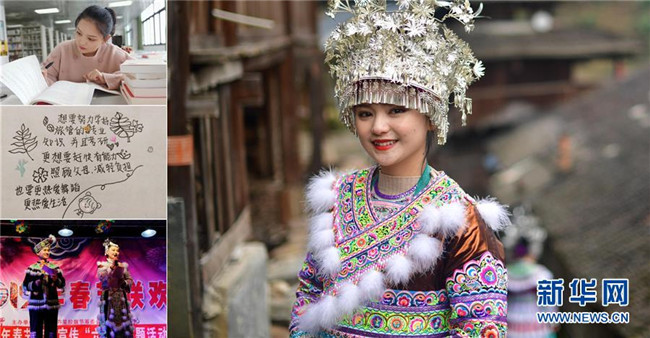 這是一張拼版照片:右圖為楊琳詩瑤(2月16日新華社記者黃孝邦攝);左上圖為楊琳詩瑤在學校圖書館里學習(3月23日攝,楊琳詩瑤供圖);左中圖為楊琳詩瑤在紙上寫下的夢想(3月23日攝,楊琳詩瑤供圖);左下圖為楊琳詩瑤(右)在家鄉(xiāng)主持苗寨的春節(jié)聯歡晚會(2月10日新華社記者黃孝邦攝)。楊琳詩瑤是融水苗族自治縣桿洞鄉(xiāng)桿洞村的苗族姑娘,去年以優(yōu)異成績考上廣西民族大學。 新華社發(fā)