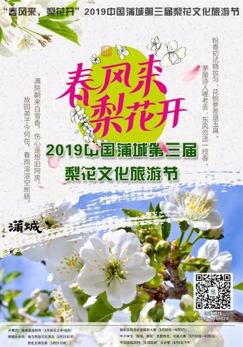蒲城是國家農(nóng)業(yè)部命名的“中國酥梨之鄉(xiāng)”,是國內(nèi)外專家公認(rèn)的"世界優(yōu)等酥梨最佳生態(tài)區(qū)"。本次活動(dòng)以“梨花”為媒介,通過系列文化體驗(yàn)活動(dòng)的舉辦,讓蒲城文化走出去,以帶動(dòng)區(qū)域旅游經(jīng)濟(jì)的發(fā)展。本屆梨花文化旅游節(jié)由陜西華山旅游集團(tuán)蒲城有限公司、蒲城縣旅游建設(shè)投資有限公司主辦,蒲城縣委宣傳部、政府辦、文化和旅游局、公安局、農(nóng)業(yè)農(nóng)村局、果業(yè)局、交通局、商務(wù)局、應(yīng)急管理局、市場(chǎng)監(jiān)督管理局、教育局、信訪局、電力局、交警大隊(duì)、電視臺(tái)、體育中心、孫鎮(zhèn)政府、橋陵鎮(zhèn)政府、陳莊鎮(zhèn)政府、椿林鎮(zhèn)政府、橋陵景區(qū)、清代考院博物館、惠陵景區(qū)、楊虎城將軍紀(jì)念館等單位協(xié)辦, 以“賞萬頃梨花 游將相故里 咥蒲城美味”為主題,3月30至4月3日在陜西蒲城縣舉行。