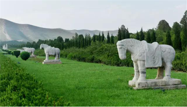 橋陵的石馬也有著自己的特色,膘肥體壯、披戴華麗,與昭陵六駿形成鮮明對比,昭陵六駿四蹄生風(fēng)、英姿颯爽,為大唐的江山立下了汗馬功勞。遺憾的是這些馬大部分都沒有馬嘴了,相傳石馬成精,偷吃當(dāng)?shù)乩习傩盏拿缀兔?,被人們把馬嘴給敲掉了。但奇怪的是東面有幾匹馬的馬嘴保存特好,仔細(xì)去看,會發(fā)現(xiàn)原來馬嘴上面套著馬籠子。石馬還有一個神氣的特點,用手輕拍,會發(fā)出特別清脆的金屬聲音,傳說,會給人們帶來好的運氣,寄托著人們對美好事物的向往。