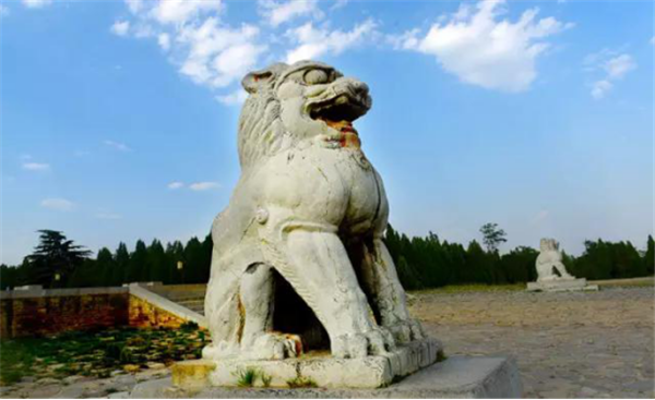 在橋陵的石雕中,特別值得一提的是橋陵的一對石獅子,歷經(jīng)千年的風(fēng)雨侵蝕,可威風(fēng)依然不減當(dāng)年,四肢健壯、昂首挺胸、怒目圓睜,顯示出“天地之間,唯我獨尊”的傲氣、霸氣,它造型優(yōu)美,氣勢磅礴,體現(xiàn)出唐代粗礦、奔放的時代氣息,而最讓人叫絕的是它的尾巴,從腿底鉆進又掏出來卷曲于背部,動物的調(diào)皮可愛活靈活現(xiàn)展現(xiàn)在我們眼前。它是石刻中的精品,石刻的精美,氣魄的宏大,堪稱“東方第一獅”。像這樣的獅子四個門前都有,保存的特別完好,東門的回頭望,西門的卷舌獅在唐代帝王陵中都是絕無僅有的。