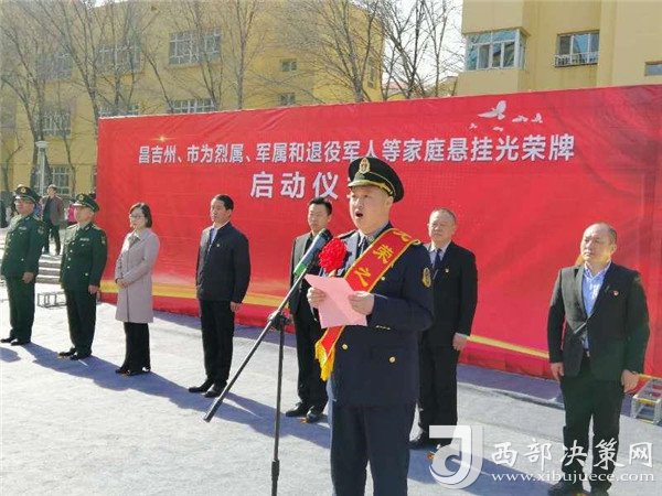 3月28日上午 ,昌吉州、市為烈屬、軍屬和退役軍人等家庭集中懸掛光榮牌啟動儀式在昌吉北京南路街道油運基地社區(qū)小游園舉行。 昌吉州、市領(lǐng)導(dǎo)、退役軍人事務(wù)局干部、現(xiàn)役軍人代表、烈屬、軍屬、退役軍人代表、各社區(qū)書記、訪惠聚工作隊隊長、雙擁干事共計300余人參加啟動儀式。