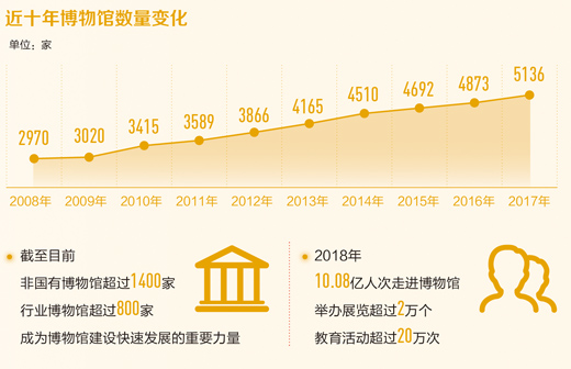據(jù)文化和旅游部統(tǒng)計(jì),2008年至今,我國博物館的數(shù)量呈現(xiàn)明顯加速增長之勢。截至2017年底,全國在各級(jí)政府備案的博物館達(dá)到了5136家,每年新增博物館平均在180家左右。