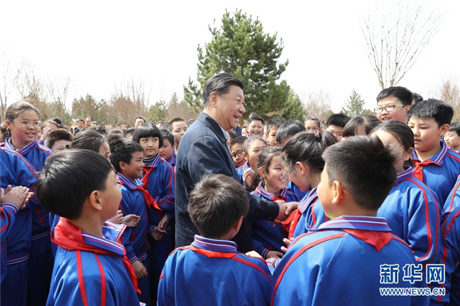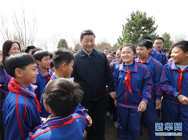 4月8日,黨和國(guó)家領(lǐng)導(dǎo)人習(xí)近平、栗戰(zhàn)書、汪洋、王滬寧、趙樂(lè)際、韓正、王岐山等來(lái)到北京市通州區(qū)永順鎮(zhèn)參加首都義務(wù)植樹活動(dòng)。這是習(xí)近平同少先隊(duì)員在一起。 新華社記者 鞠鵬 攝