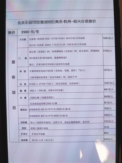 海淀區(qū)某中學(xué)則向家長公開了收費明細。在家長王先生提供的游學(xué)清單上,記者看到5天的研學(xué)旅行費用為3980元,游覽地點包括南京大屠殺遇難同胞紀念館、西湖和魯迅紀念館等。行程中還設(shè)置了眾多教育內(nèi)容,比如參加南京大學(xué)講座、著漢服行謝師禮、探究杭州西湖的光學(xué)現(xiàn)象等。
