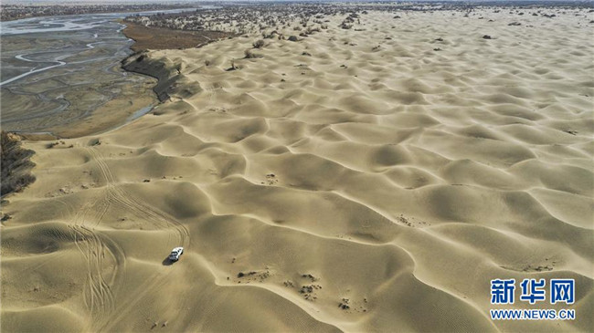 依明乘坐的汽車行駛在塔克拉瑪干沙漠中。從依明家坐車前往于田縣城,全程不足300公里,越野車需行駛7小時左右(3月19日無人機(jī)拍攝)。新華社記者 胡虎虎 攝