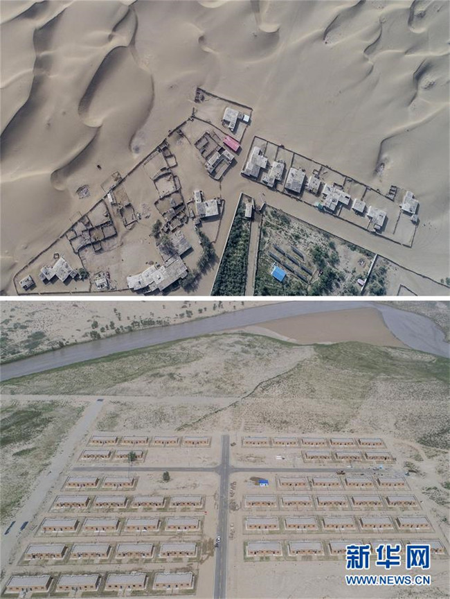 拼版照片:上圖為地處沙漠腹地的新疆于田縣達(dá)里雅布依鄉(xiāng)一處村落(2018年9月6日無人機(jī)拍攝);下圖為建設(shè)中的達(dá)里雅布依小鎮(zhèn)易地扶貧安置點(2018年9月8日無人機(jī)拍攝)。新華社記者 胡虎虎 攝