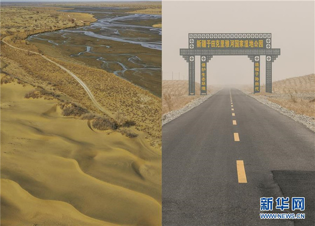 拼版照片:左圖為沿著克里雅河通向地處沙漠深處新疆于田縣達(dá)里雅布依鄉(xiāng)的路(3月19日無人機(jī)拍攝);右圖為從縣城通往達(dá)里雅布依小鎮(zhèn)易地扶貧安置點的柏油路(3月20日攝)。新華社記者 胡虎虎 攝
