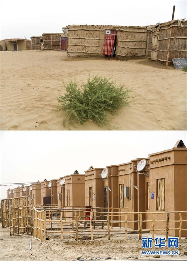 拼版照片:上圖為新疆于田縣達(dá)里雅布依鄉(xiāng)的民居(2018年9月7日攝);下圖為達(dá)里雅布依小鎮(zhèn)易地扶貧安置點的房屋(2019年3月20日攝)。新華社記者 胡虎虎 攝