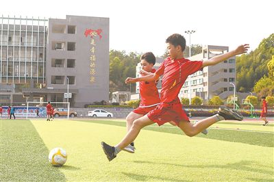 日前,湖北省武漢市英山縣思源實(shí)驗(yàn)學(xué)校綠茵操場(chǎng)上,學(xué)生正在進(jìn)行攔截?fù)屒蛴?xùn)練。為了培養(yǎng)學(xué)生的足球興趣,該校開展了“陽光足球大課間”體育活動(dòng),倡導(dǎo)全體師生充分享受課間足球運(yùn)動(dòng)。(單藝偉/攝)