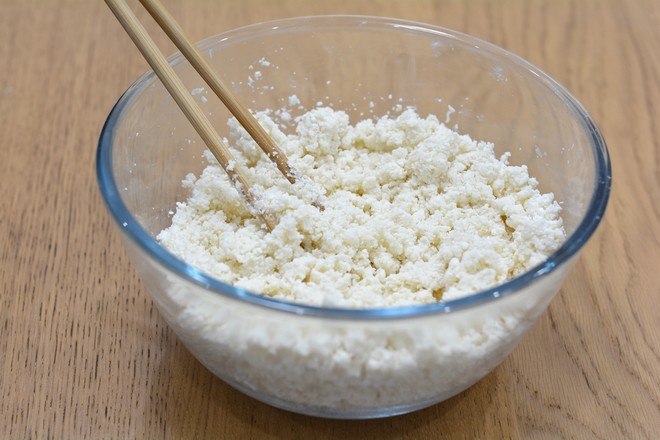 2.將適量的開(kāi)水轉(zhuǎn)圈倒入面粉中,用筷子不斷攪拌成絮狀;