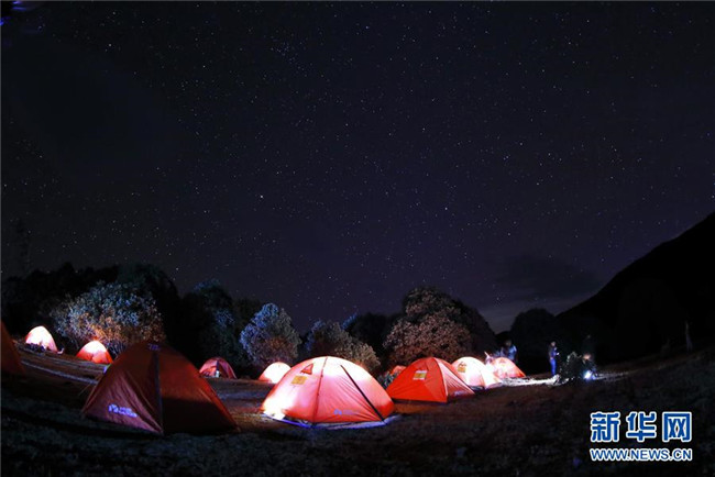 4月23日,來(lái)自攀枝花市的戶(hù)外愛(ài)好者在龍頭山露營(yíng)。 近日,四川省攀枝花市鹽邊縣龍頭山十余萬(wàn)畝野生杜鵑花盛開(kāi),吸引省內(nèi)外游客前來(lái)登山賞花。 龍頭山位于四川省攀枝花市鹽邊縣北部的紅寶苗族彝族鄉(xiāng)境內(nèi),這里的野生杜鵑花花期為2月至5月。 新華社記者 江宏景 攝