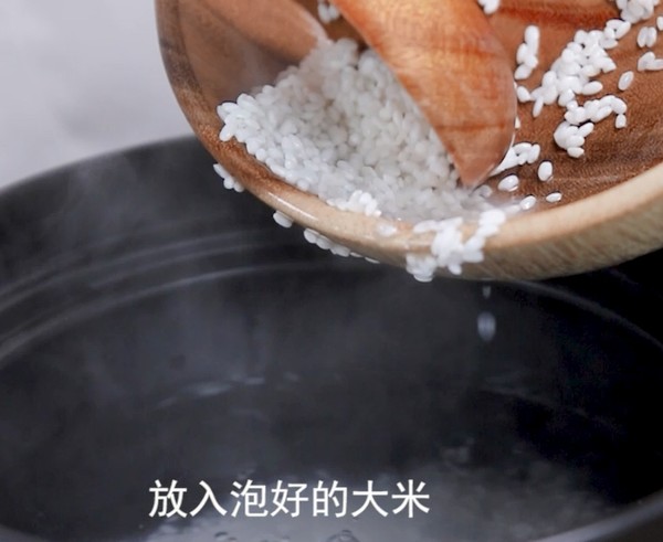 \n放入泡好的大米再放入腌制好的肉沫和香油攪拌開(kāi),大火燒開(kāi),轉(zhuǎn)小火熬煮30分鐘