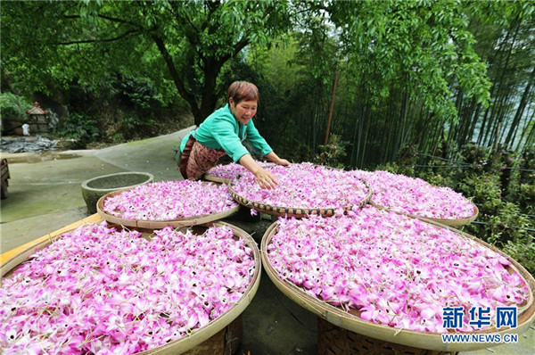 5月4日,在貴州省赤水市白云鄉(xiāng)平灘村,農戶在晾曬剛采摘的金釵石斛鮮花。