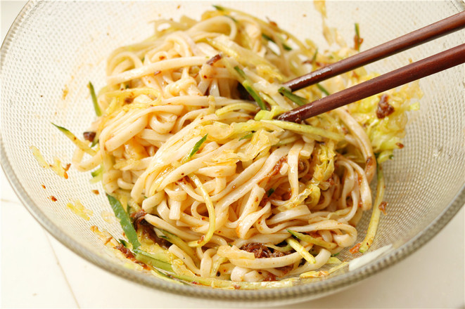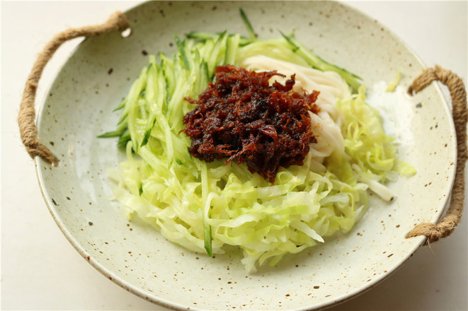 7.再加上切好的黃瓜絲和焯好水的圓白菜絲,再加上一勺香辣肉松醬。