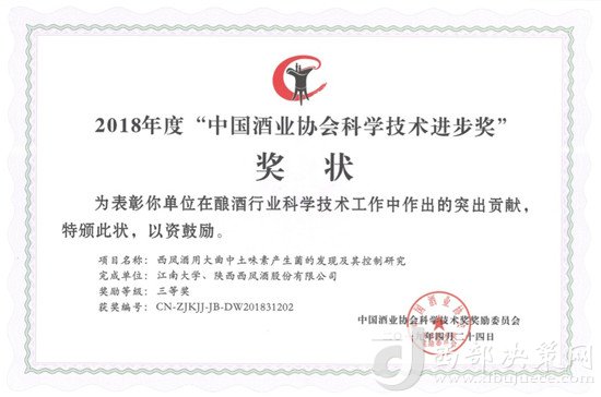 近日,中國酒業(yè)協(xié)會第五屆理事會擴大會議在北京隆重舉行,大會突出表彰了在釀酒產(chǎn)業(yè)科技發(fā)明、技術(shù)推廣、科技成果轉(zhuǎn)化等方面取得了杰出業(yè)績和重要貢獻的領(lǐng)軍人才和優(yōu)秀專家,表彰了2018年度“中國酒業(yè)協(xié)會科學(xué)技術(shù)獎”獲獎項目和論文的完成單位及個人,并頒發(fā)證書及獎金。西鳳集團公司《西鳳酒用大曲中土味素產(chǎn)生菌的發(fā)現(xiàn)及其控制研究》項目榮獲中國酒業(yè)協(xié)會科學(xué)技術(shù)進步獎三等獎。受到了大會表彰。