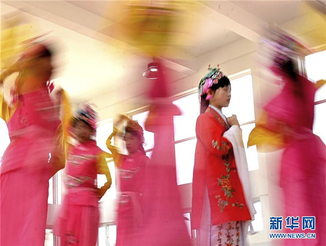 5月14日,淄博市沂源縣東里鎮(zhèn)水北小學的學生在練習戲曲表演。 新華社發(fā)(趙東山 攝)