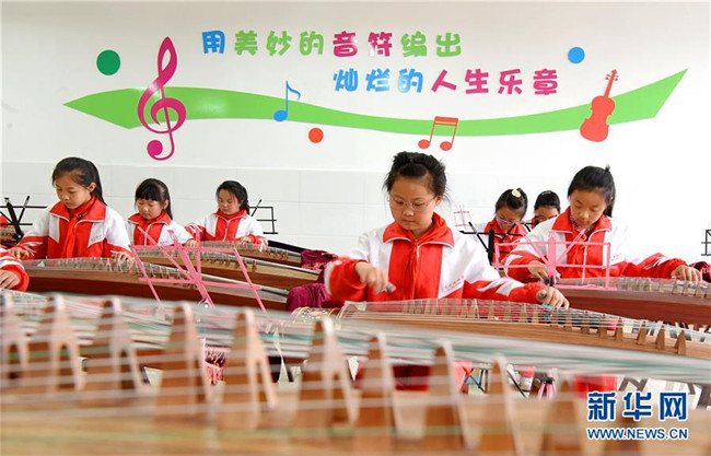 5月14日,淄博市沂源縣振興路小學的學生在學習彈奏古箏。 新華社發(fā)(趙東山 攝)