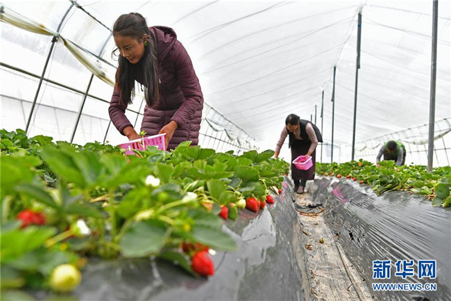 5月14日,久巴村村民曲珍(左)、央宗(中)和尼瑪曲吉在大棚里采摘草莓。 新華社記者 李鑫 攝