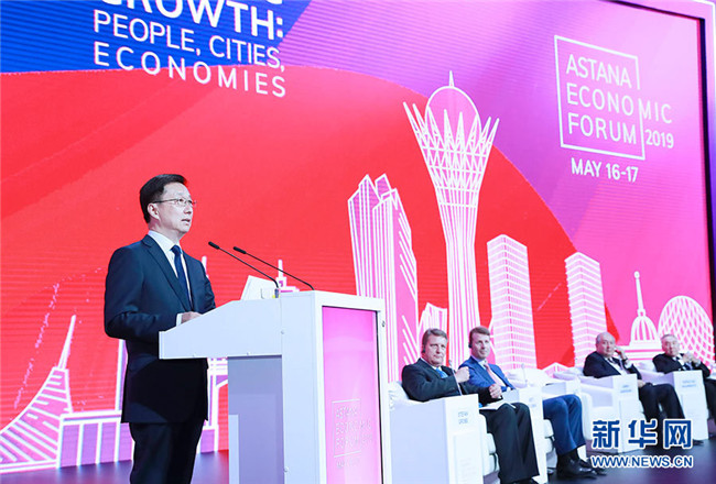 5月16日,中共中央政治局常委、國務院副總理韓正出席在努爾蘇丹舉行的第十二屆阿斯塔納經濟論壇。 新華社記者 劉彬 攝