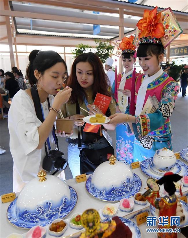 5月16日,在北京奧林匹克公園,參觀者品嘗北京風(fēng)味小吃。新華社記者 王毓國(guó) 攝