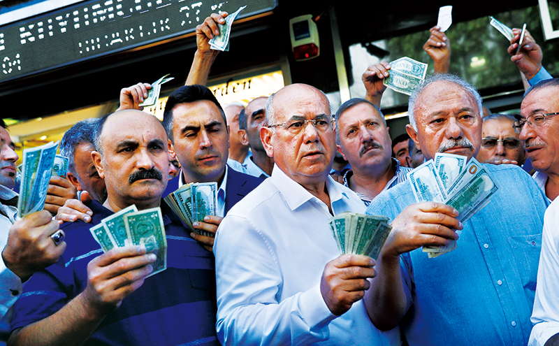2018年,由于美聯(lián)儲加息導(dǎo)致國際游資大規(guī)?;亓鳎绹鴮ν炼?、伊朗進(jìn)行制裁以及貿(mào)易保護(hù)主義的影響,俄羅斯、阿根廷、土耳其、南非等不少經(jīng)濟(jì)體貨幣遭遇大幅貶值。圖為2018年8月14日,在土耳其首都安卡拉,人們響應(yīng)政府號召,手持美元站在貨幣兌換處前,出售手中的美元支持本國貨幣里拉。 新華社/路透