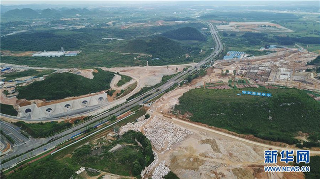 這是5月19日無(wú)人機(jī)拍攝的貴州省貴安新區(qū)“華為云”數(shù)據(jù)中心建設(shè)現(xiàn)場(chǎng)(以道路為界右)和騰訊貴安七星數(shù)據(jù)中心(左)。新華社記者 歐東衢 攝
