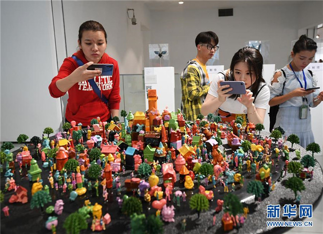 5月24日,觀眾在畢業(yè)生作品展上參觀綜合材料作品《游園會》。