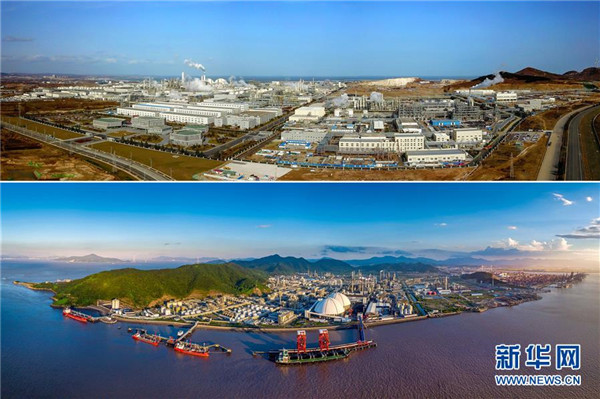 上圖:萬(wàn)華煙臺(tái)工業(yè)園航拍畫(huà)面(2018年12月4日無(wú)人機(jī)拍攝,新華社記者郭緒雷攝);下圖:萬(wàn)華寧波公司全景圖(資料照片)。新華社發(fā)