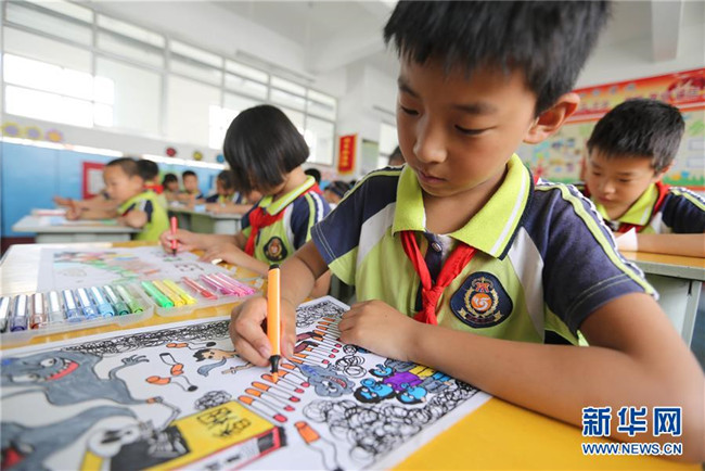 5月30日,臨沂市沂南縣第五實(shí)驗(yàn)小學(xué)的學(xué)生在繪制無煙日手抄報(bào)。新華社發(fā)(王彥冰 攝)