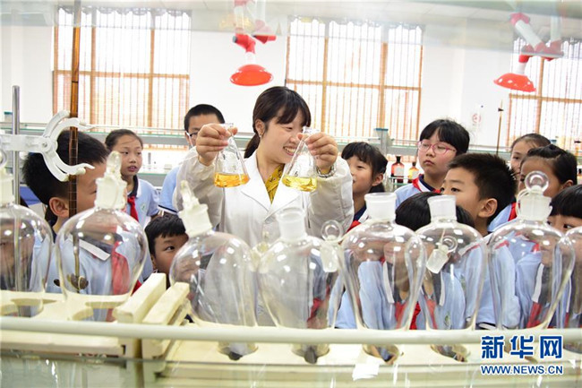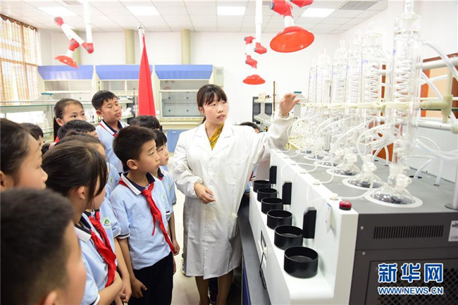 6月4日,自來水廠工作人員向小學生介紹檢測自來水的儀器。