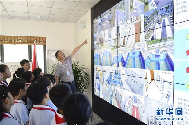 6月4日,自來水廠工作人員向小學生講解自來水生產過程。