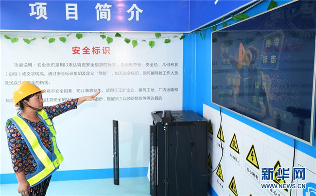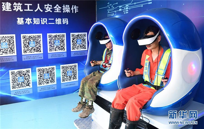 6月5日,重慶化龍橋超高層項(xiàng)目工人在VR安全體驗(yàn)館內(nèi)通過特種標(biāo)識(shí)識(shí)別系統(tǒng)學(xué)習(xí)安全標(biāo)識(shí)。新華社記者 王全超 攝