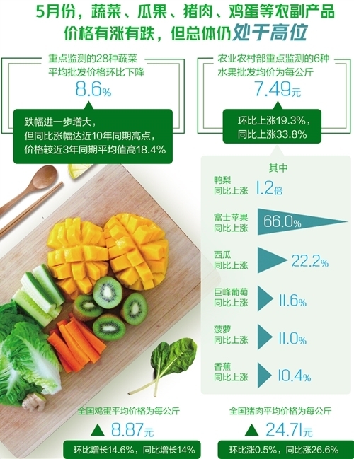 從數(shù)據(jù)來看,雖然5月份蔬菜、瓜果、豬肉、雞蛋等農(nóng)副產(chǎn)品價格有漲有跌,但總體仍處于高位。