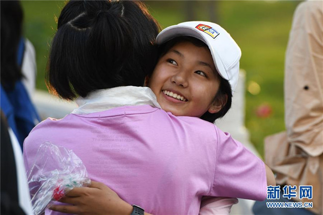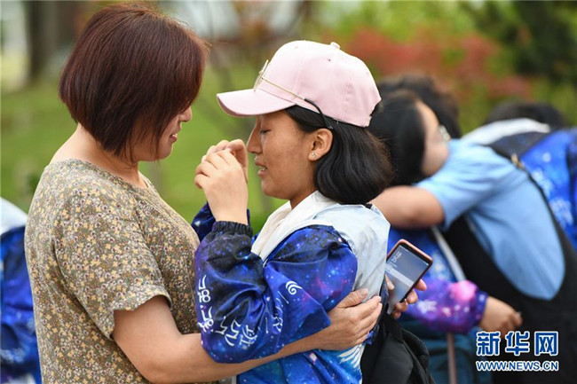 6月9日,合肥市第三十五中學西藏班的初三畢業(yè)生(右)與校友告別。