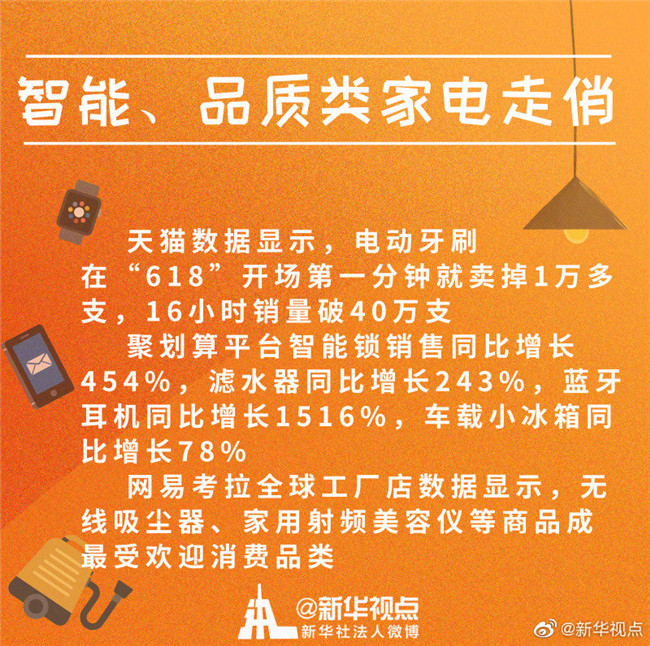 除了滿足“剛需”的大家電,提升生活品質(zhì)的小家電也十分走俏。天貓數(shù)據(jù)顯示,電動(dòng)牙刷在“618”開場(chǎng)第一分鐘就賣掉1萬多支,16小時(shí)銷量破40萬支。聚劃算平臺(tái)智能鎖銷售額同比增長454%,濾水器同比增長243%,藍(lán)牙耳機(jī)同比增長1516%,車載小冰箱同比增長78%。在網(wǎng)易考拉全球工廠店,無線吸塵器、家用射頻美容儀等商品成最受歡迎消費(fèi)品類。