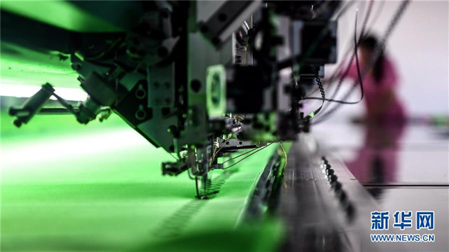6月18日,在廣西隆林縣輕工業(yè)園區(qū)一家服裝廠,來自易地扶貧搬遷安置點的一名婦女在“扶貧車間”縫制衣服。