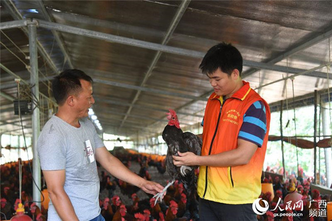 潞城瑤族鄉(xiāng)豐防村第一書(shū)記龍啟倍向養(yǎng)雞農(nóng)戶了解養(yǎng)殖情況