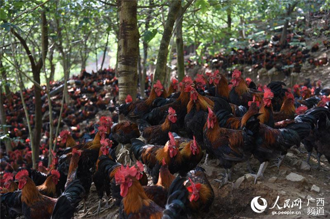 6月18日,在廣西田林縣潞城瑤族鄉(xiāng)豐防村的林下養(yǎng)雞養(yǎng)殖場(chǎng),一群群瑤土雞來(lái)回踱步,在林間或雞棚覓食。一見(jiàn)到生人,便飛快地跑向密林深處,響起一陣此起彼伏的叫聲。
