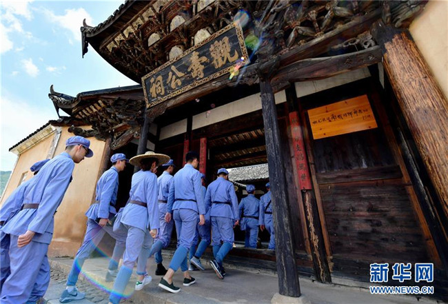 6月17日,在長(zhǎng)汀縣南山鎮(zhèn)中復(fù)村的觀壽公祠,媒體記者在重溫當(dāng)年紅軍長(zhǎng)征前的場(chǎng)景。 新華社記者魏培全攝
