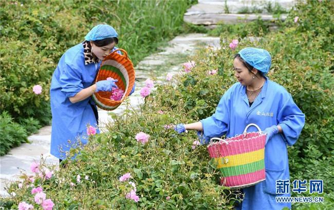 6月26日,在四川省小金縣清多香玫瑰種植專業(yè)合作社,工人在采摘玫瑰。新華社記者 高健鈞 攝