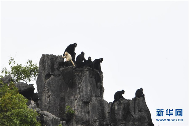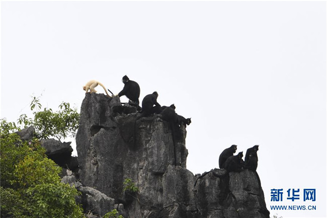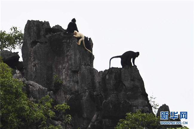 7月4日,白化黑葉猴幼體和同種群其他黑葉猴出現(xiàn)在廣西大新縣桃城鎮(zhèn)寶新村城南小學后山上。 新華社記者 曹祎銘 攝